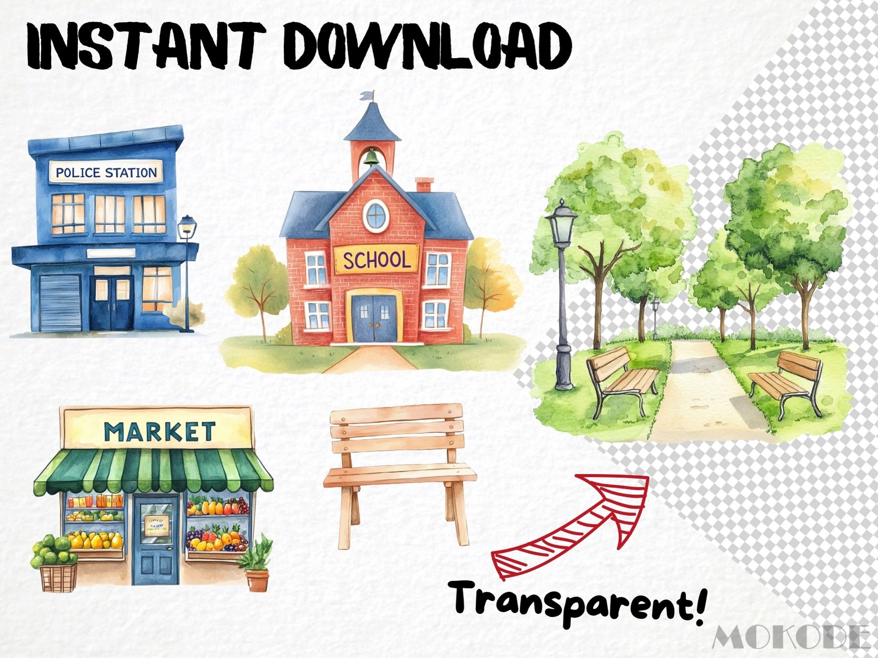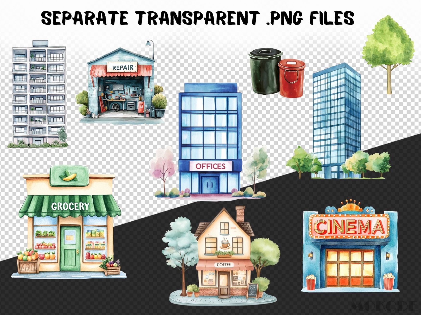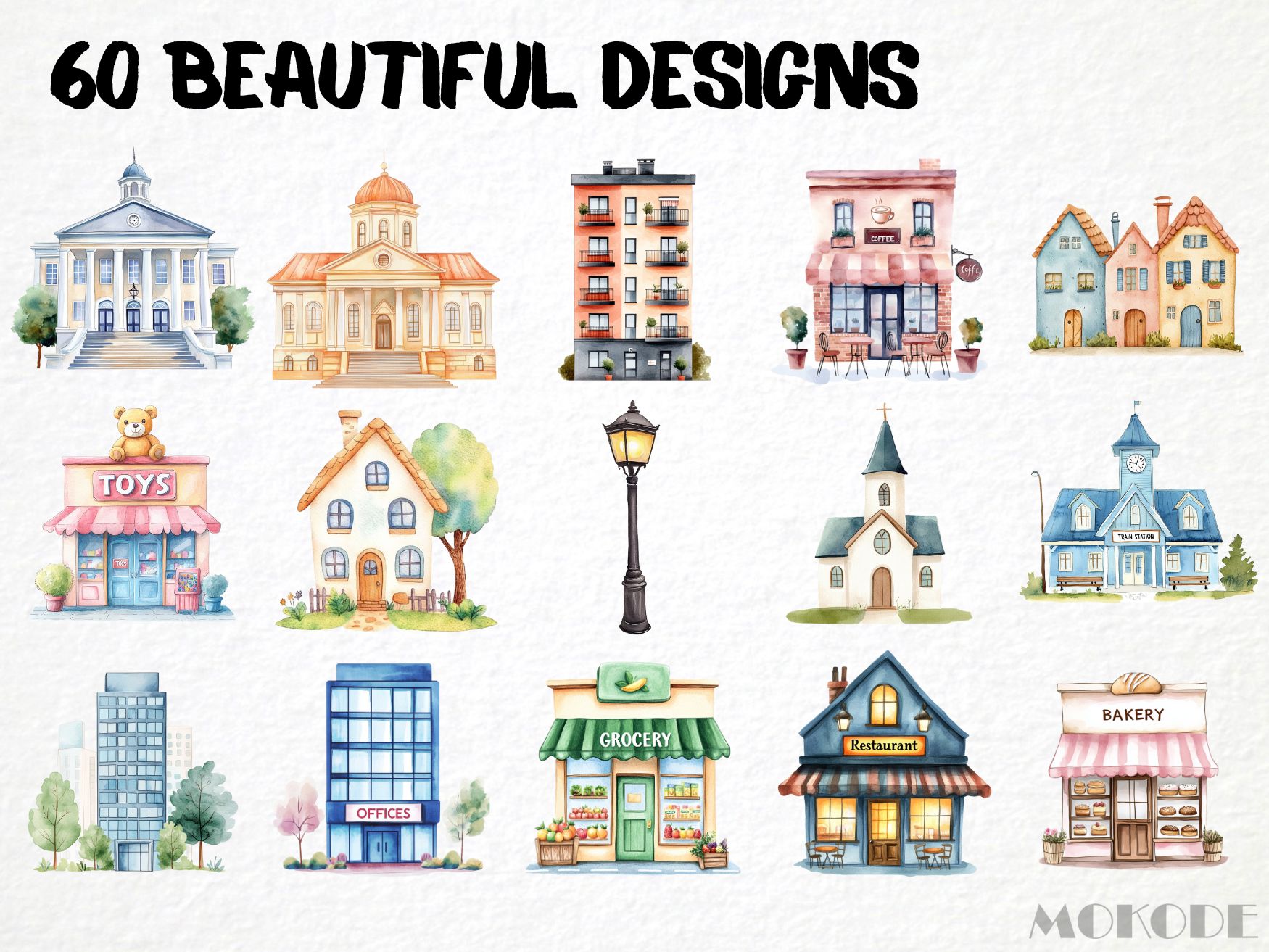 Enhance your creative projects with our Watercolor Cute City Clipart Bundle.