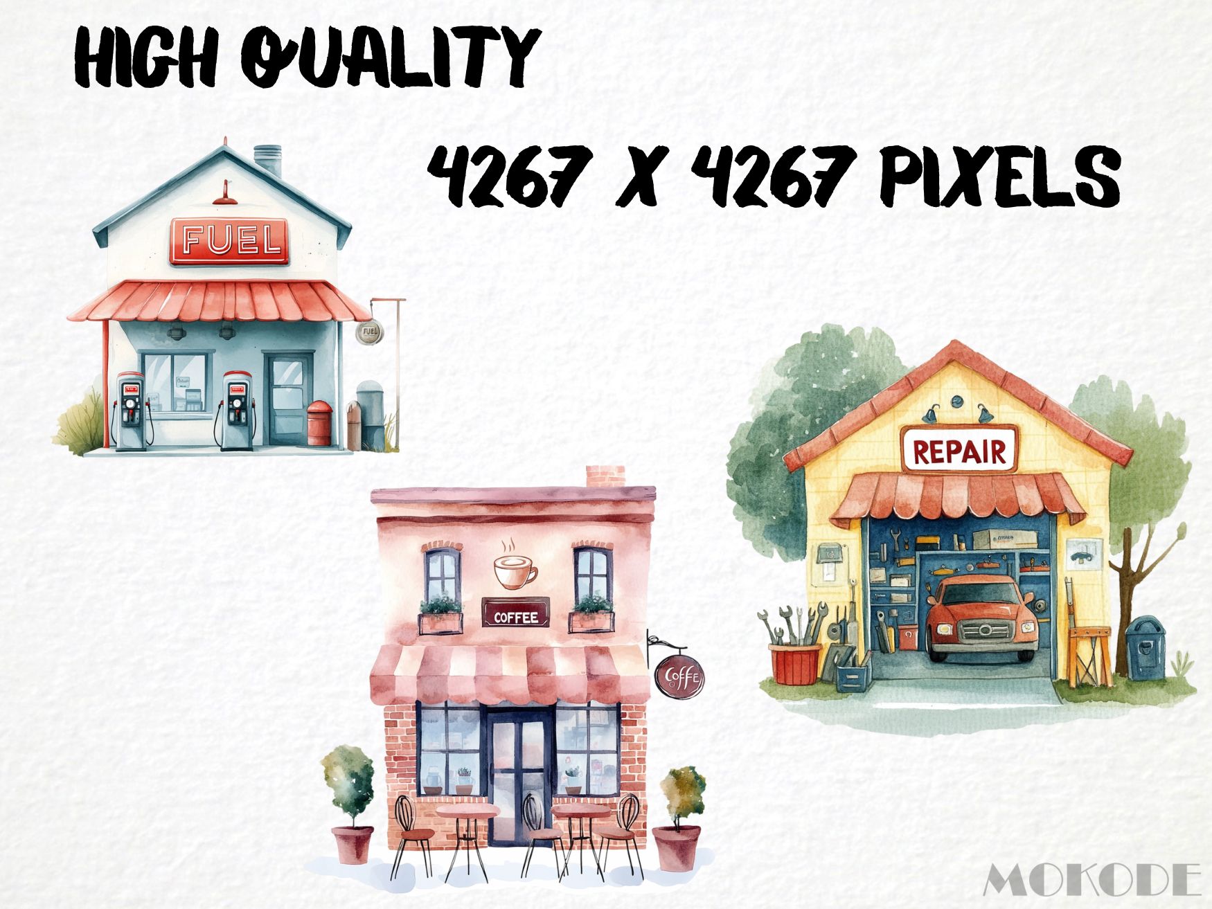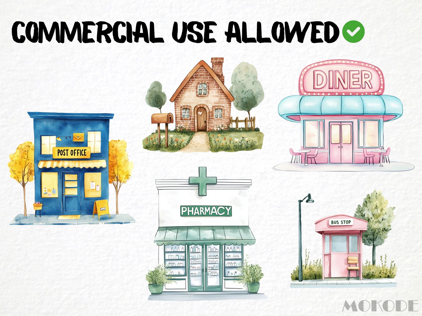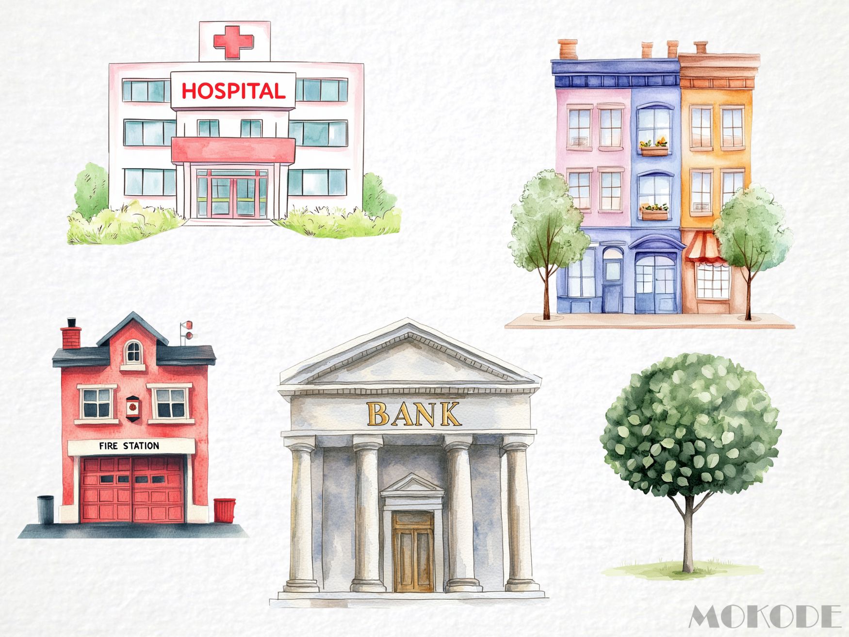 Enhance your creative projects with our Watercolor Cute City Clipart Bundle.